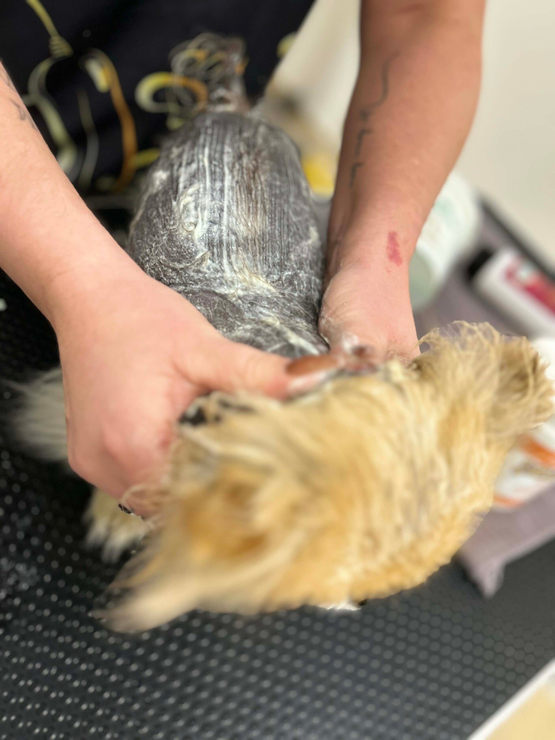 Ci-dessous, un chien suivi au salon bénéficiant d'un protocole de spa à l'ozone, mis en place pour accompagner une problématique d'alopécie.